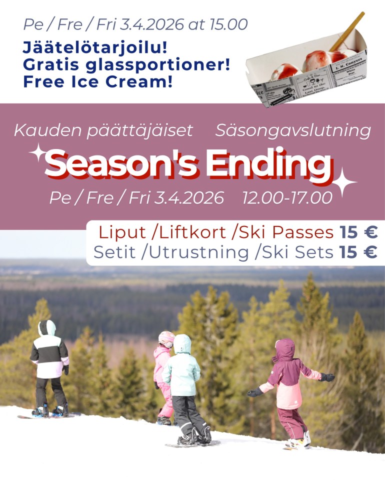 Paikan päällä Ski Shop on avoinna vielä päättäjäispäivän pe 3.4.2026 – kuten rinteet.